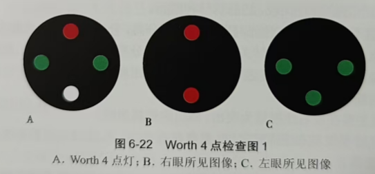 如图6-22A所示,由一个红视标点、两个十字绿色视标、一个圆形白色视标组成,通常将红色视标排列在最上方,左和右显示绿色视标,底部显示白色视标。检查时患者配戴红绿眼镜。眼镜与四点视标的红绿互补,根据红绿为互补色的关系,被检者通过红绿镜片注视此4点时,戴红色镜片的眼睛看不见绿色光点,只能看到两个红色视标(本身的红色视标和白色视标看成红色如图6-22B),戴绿色镜片的眼睛看不见红色光点。只能看到三个绿色的视标(本身左右的两个绿色字视标和白色圆形视标看成绿色),如图6-22C。根据患者在双眼注视状态下,观察到的不同视觉表现,进行视觉功能的判断。